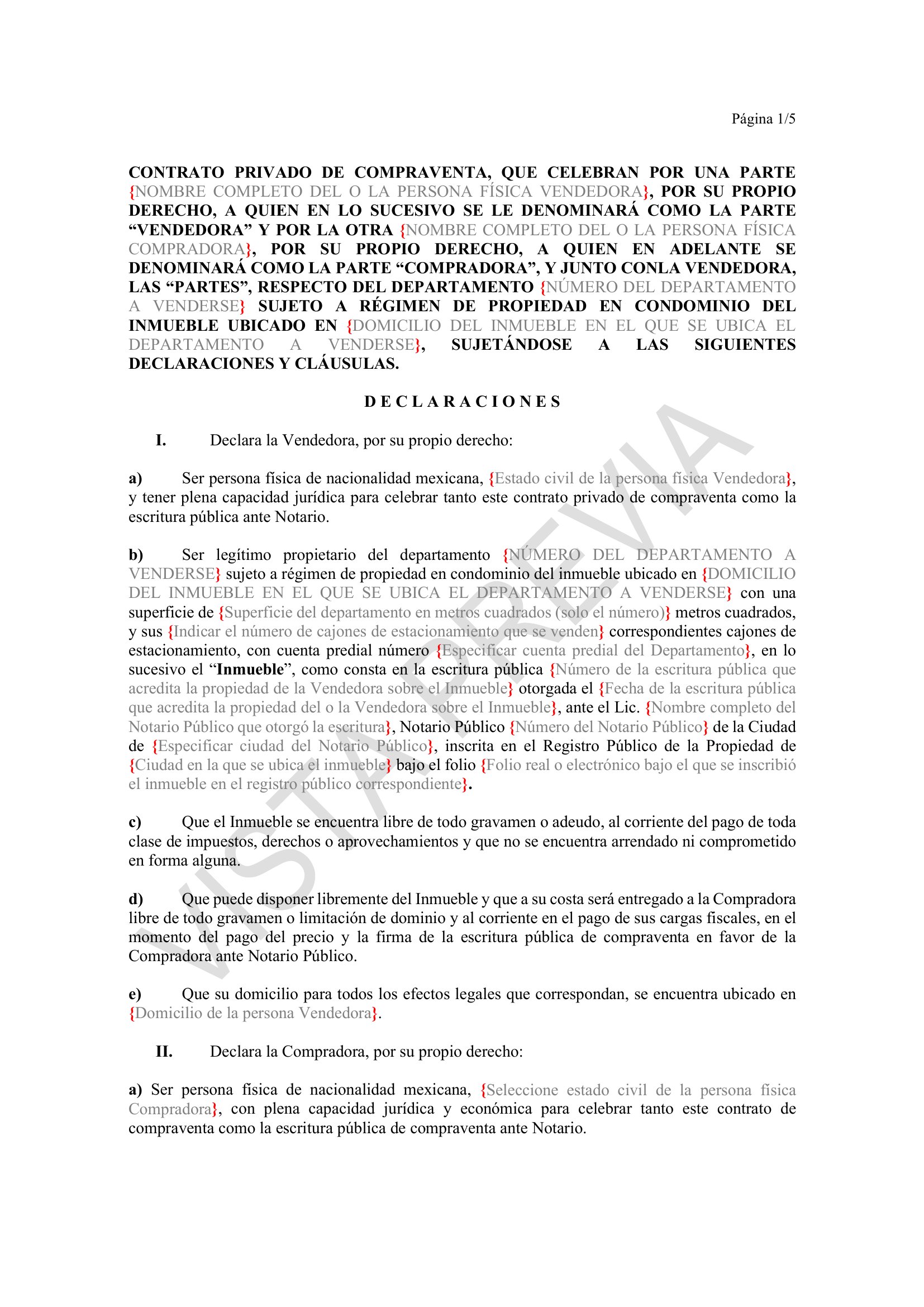 Es un acuerdo legal entre dos partes, el vendedor y el comprador, en el que se establecen las condiciones para la transferencia de propiedad de un departamento. Este contrato incluye detalles como el precio de venta, la descripción del inmueble, las obligaciones de ambas partes y cualquier otra condición relevante para la transacción