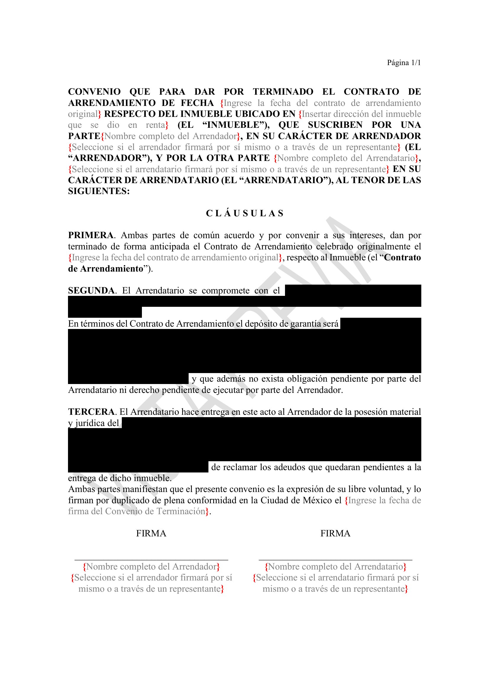 Un Convenio de Terminación de Arrendamiento es un acuerdo legal mediante el cual se pone fin a un contrato de arrendamiento existente. Este documento puede ser firmado de mutuo acuerdo entre el arrendador y el arrendatario, o puede ser unilateral si una de las partes decide terminar el contrato por alguna causa justificada.